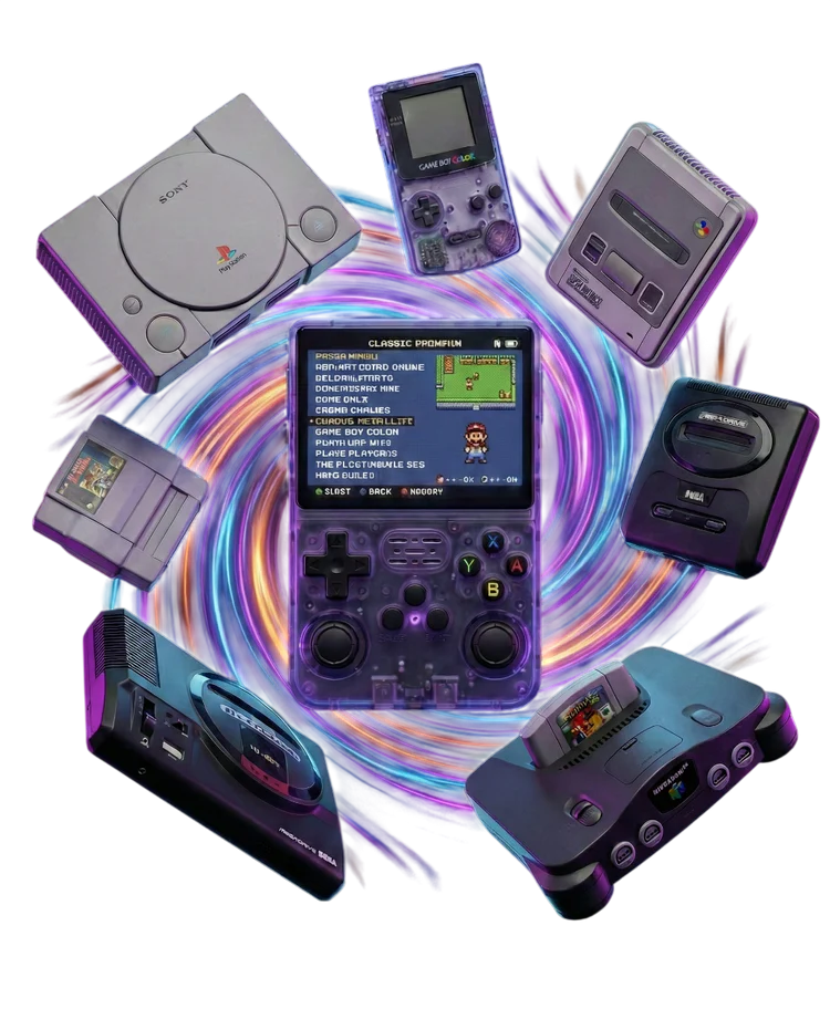 emblématiques comme la NES, SNES, PlayStation 1, Sega, Game Boy, etc.